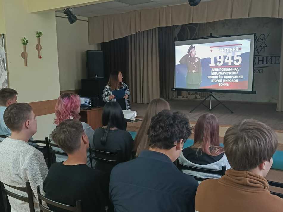 3 сентября в ДК "Настроение" состоялась встреча в рамках "Исторической академии" для старшеклассников, посвященная Дню Победы над милитаристской Японией и окончанию Второй мировой войны.