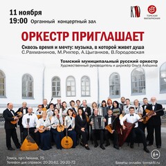 11 ноября, в 19:00, на сцене Органного концертного зала — оркестр русских народных инструментов с программой, которая объединяет шедевры симфонической музыки и оригинальные сочинения, наполненные тонкой глубиной и душевным светом!