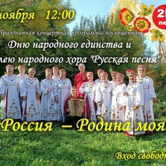 2 ноября в 12:00 в ДК "Настроение" состоится праздничная концертная программа "Россия - Родина моя", объединяющая два значимых события - 25-летний юбилей нашего любимого народного хора “Русская песня” и День народного единства!